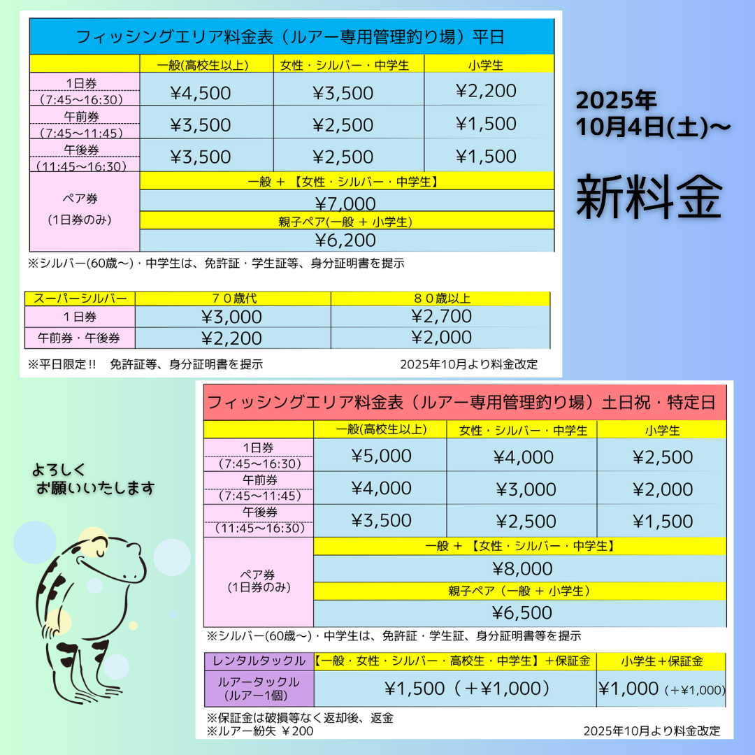 10月4日(土)2号池のみのプレオープンになります。池の状況、魚の状態によっては予定変更となりますのでご了承いただけますようよろしくお願いいたします。
