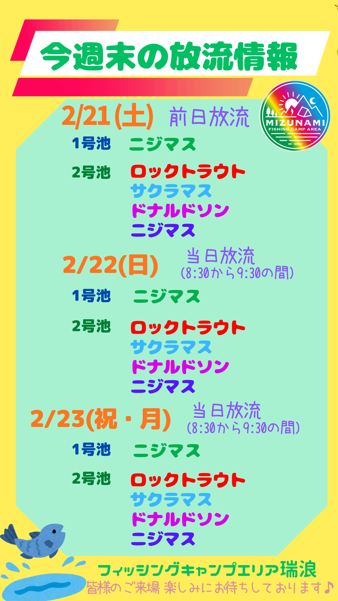2026年2月21日(土) 2月22日(日) 2月23日(月/祝) 放流情報🐟