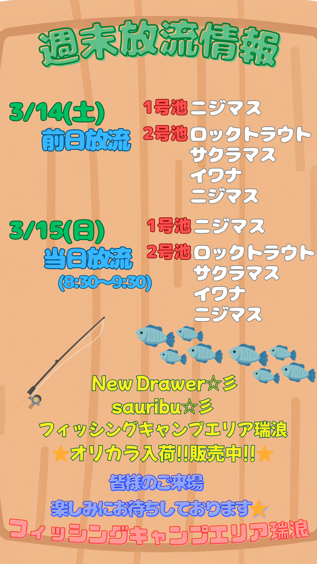 2026年3月14日(土) 3月15日(日) 放流情報🎣